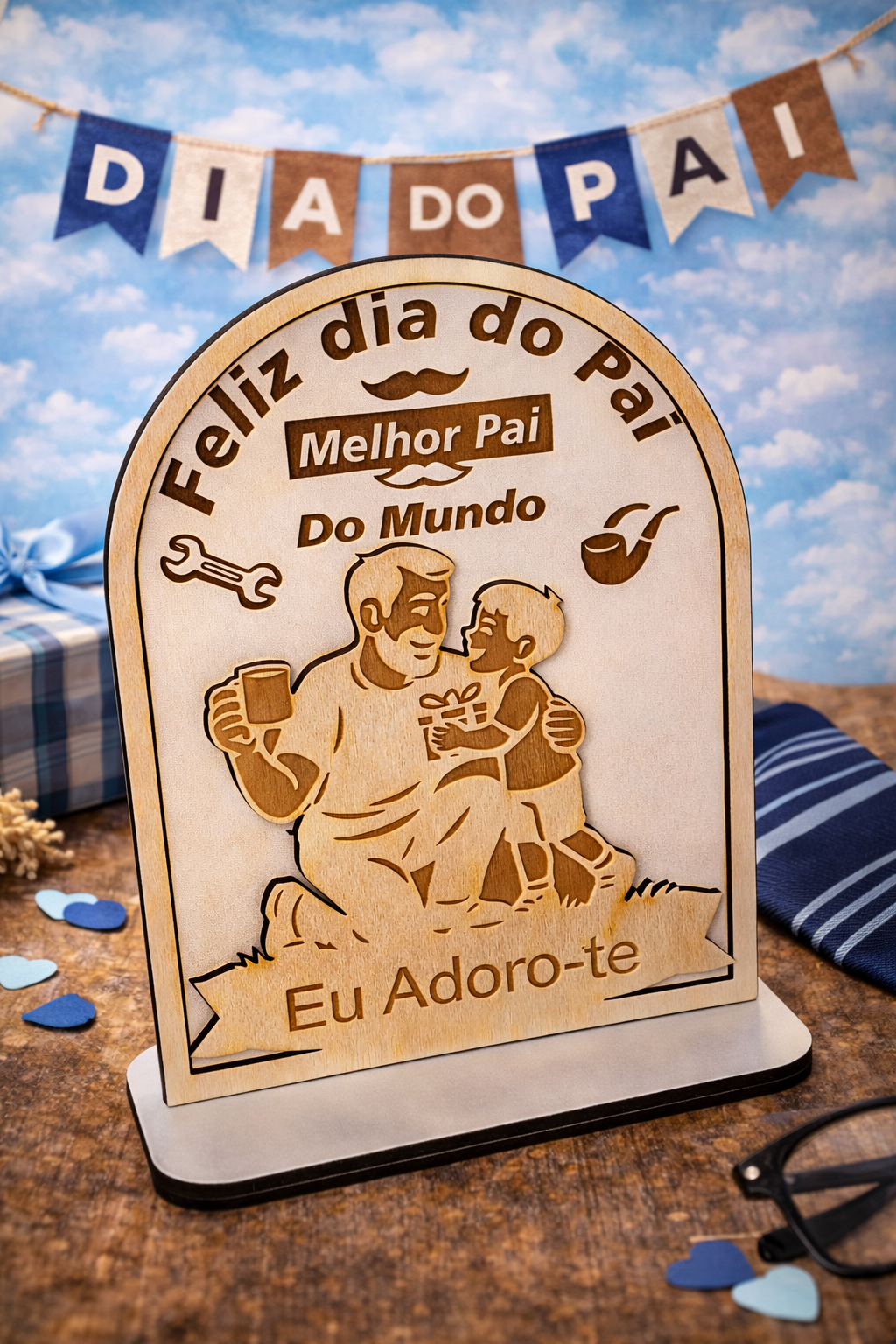 Com um design delicadamente recortado e gravado em madeira, apresenta uma ilustração ternurenta de pai e filho, acompanhada da mensagem “Feliz Dia do Pai – Melhor Pai do Mundo – Eu Adoro-te”.