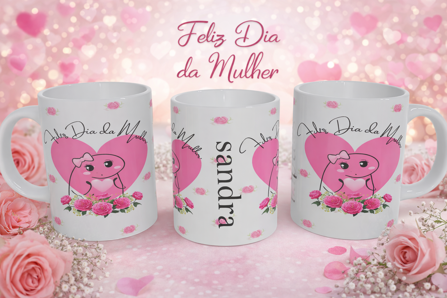 A Caneca Personalizada “Feliz Dia da Mulher” combina uma ilustração delicada em tons rosa, detalhes florais e um coração central que simboliza amor, força e ternura.
