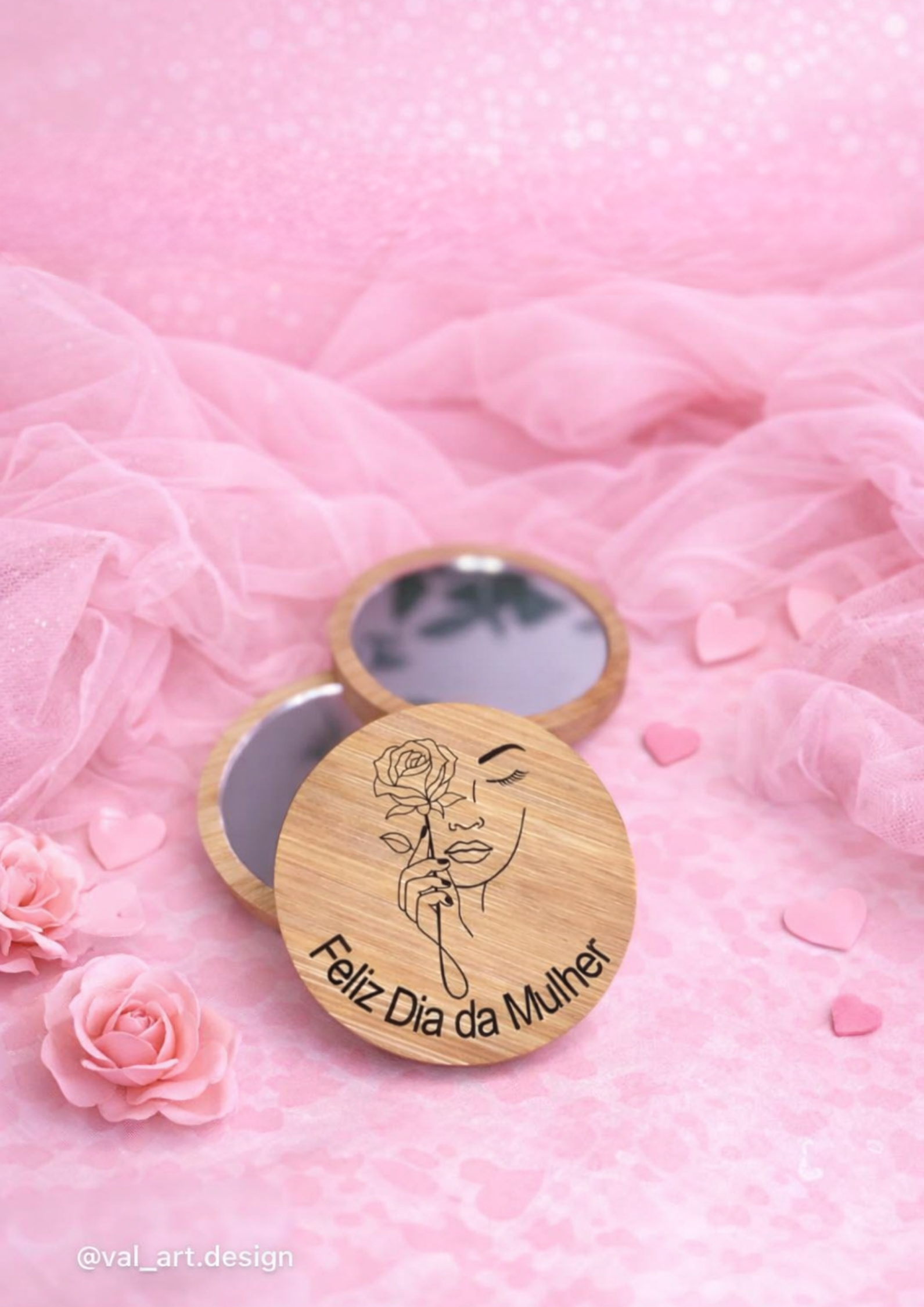 O Espelho de Bolsa em Bambu “Feliz Dia da Mulher” combina beleza natural com um design delicado gravado a laser.