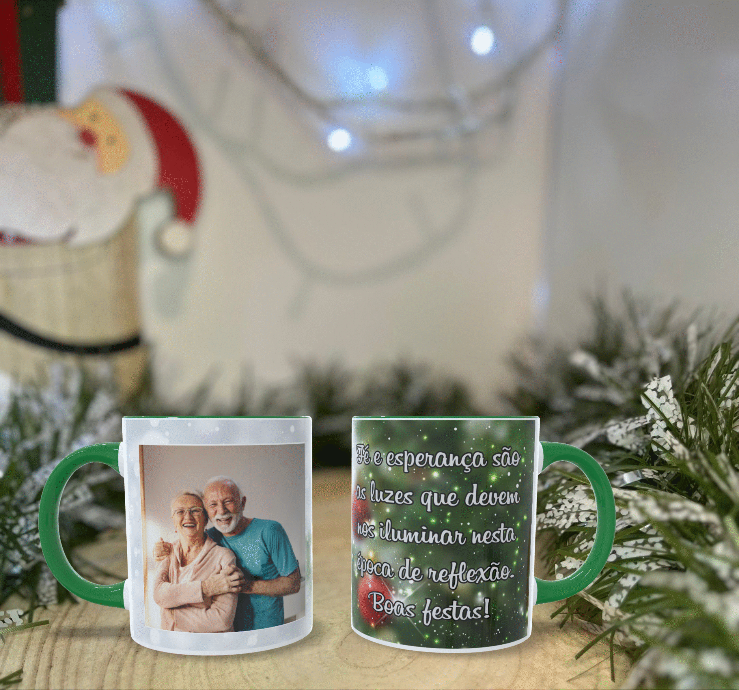 Com o design festivo e a frase inspiradora “Fé e esperança são as luzes que devem nos iluminar nesta época de reflexão. Boas festas!”, esta caneca é perfeita para oferecer como presente ou incluir na tua decoração natalina.