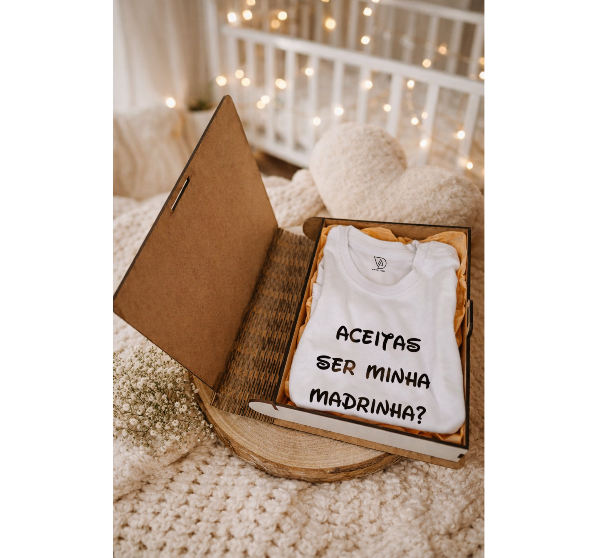 Com design elegante em formato de livro, esta peça simboliza o início de uma nova história. A tampa personalizada com o nome da futura madrinha e a frase
