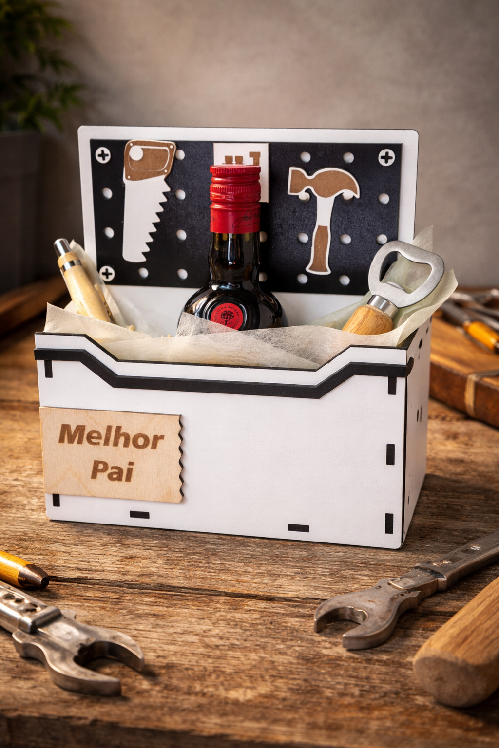 Com detalhes decorativos alusivos a ferramentas e placa gravada com a mensagem “Melhor Pai”, é um presente simbólico que demonstra reconhecimento e carinho.