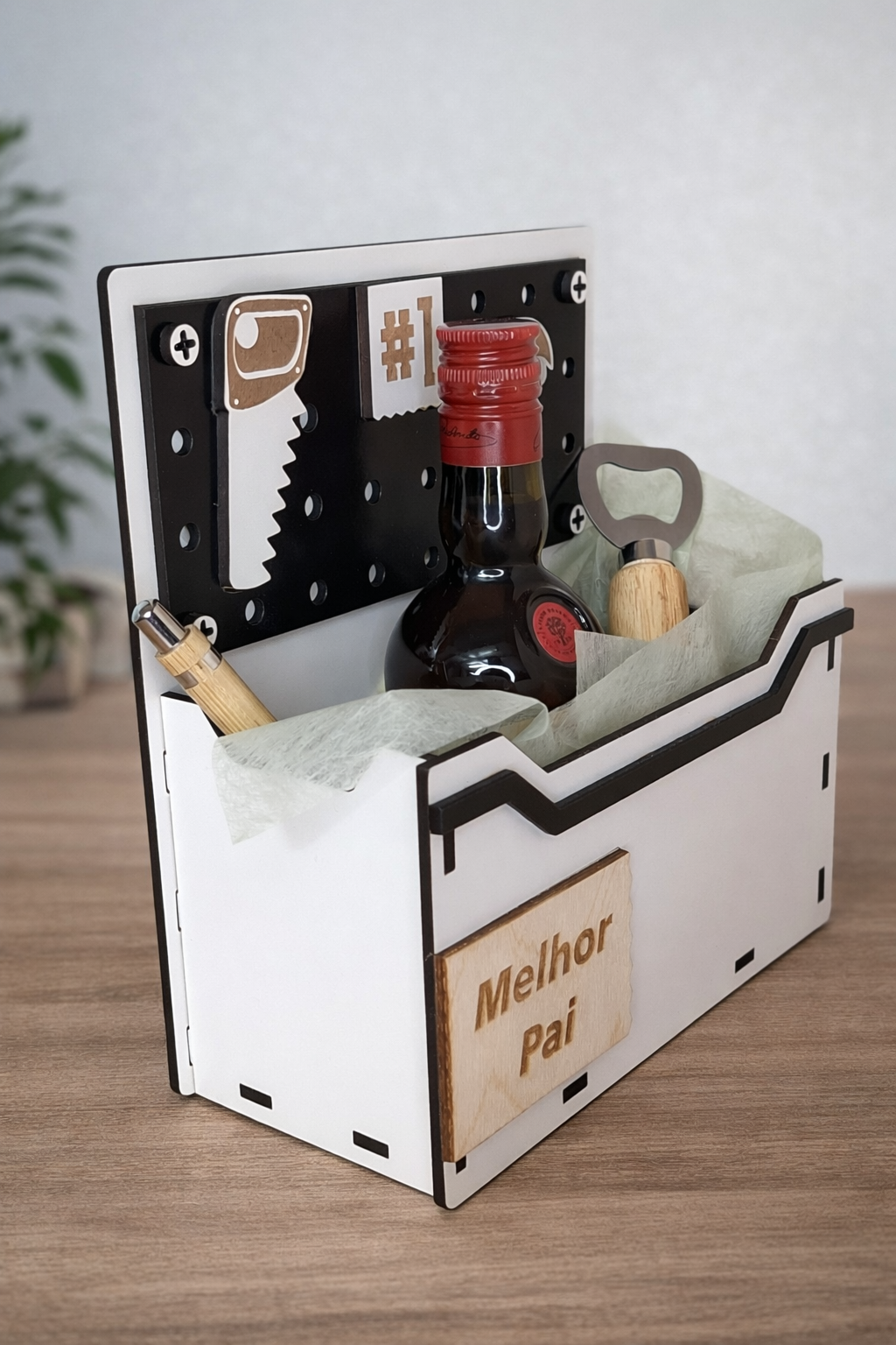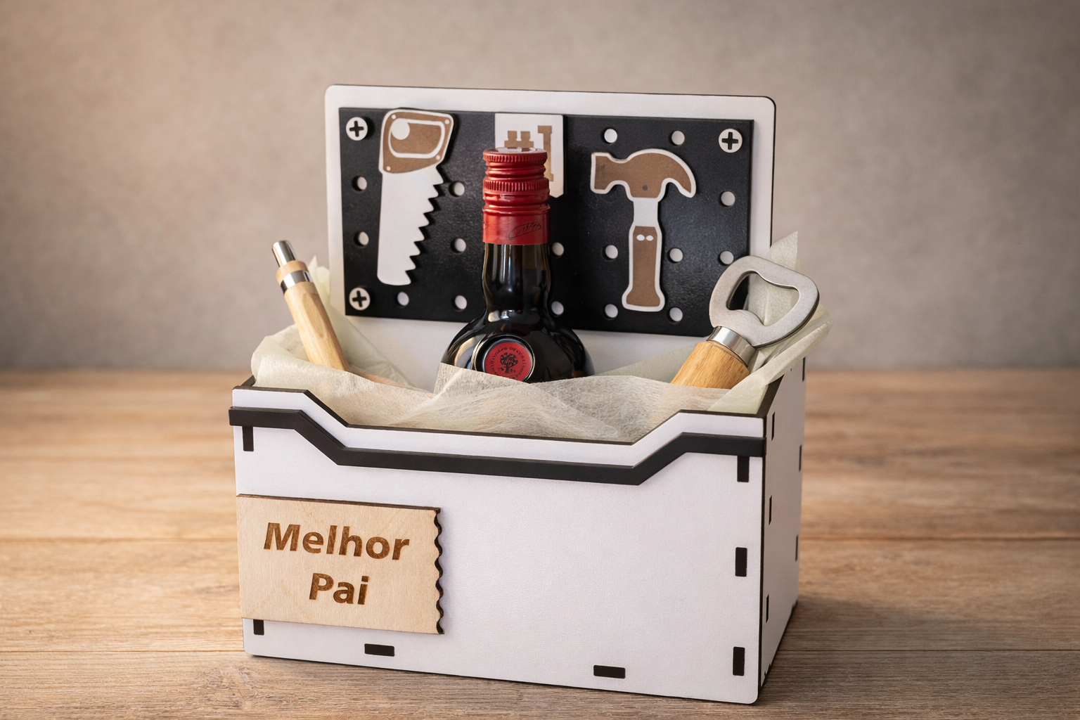 Inspirada numa caixa de ferramentas, esta peça em madeira combina design criativo com funcionalidade. Inclui compartimento para garrafa (Incluída) e espaço para pequenos acessórios, tornando-a ideal para montar um kit personalizado ao gosto do pai.