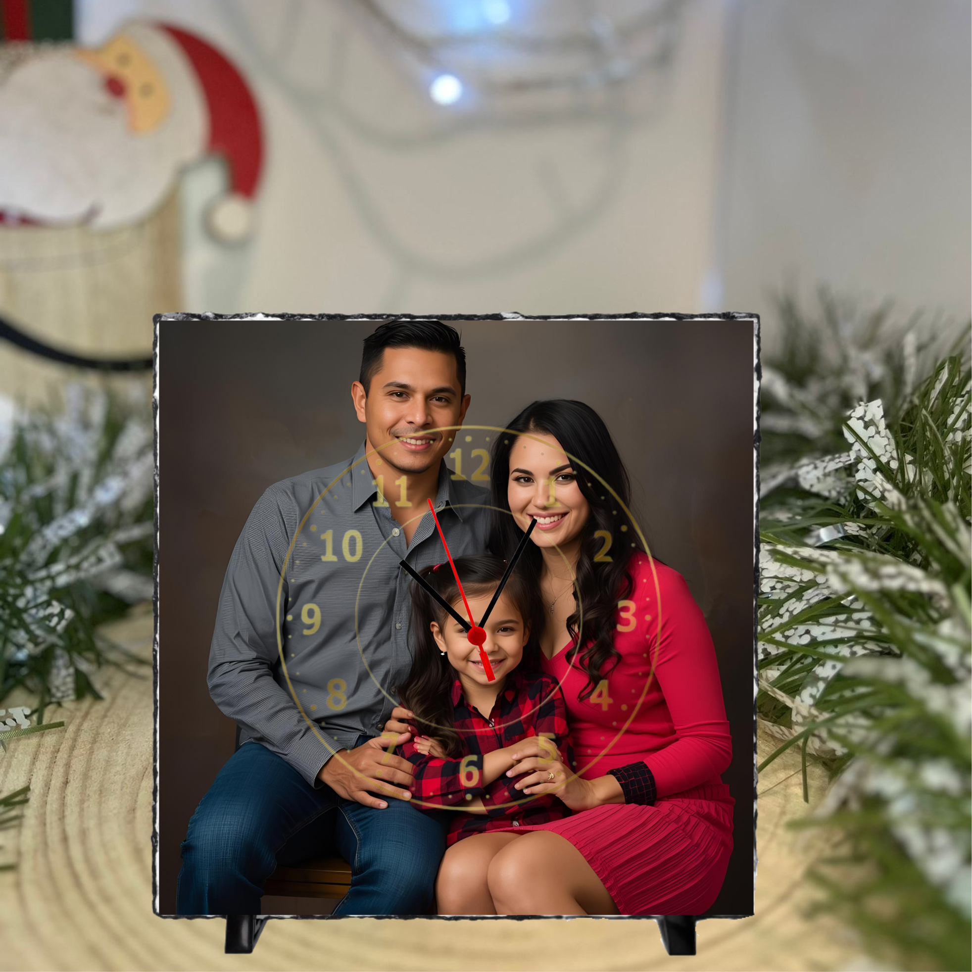 A fotografia é impressa diretamente na superfície, garantindo cores vivas, detalhes nítidos e um acabamento duradouro. O relógio de ponteiros adiciona um toque elegante e funcional, tornando esta ardósia perfeita para presentes personalizados, recordações familiares, decorações de interior ou lembranças de ocasiões especiais.