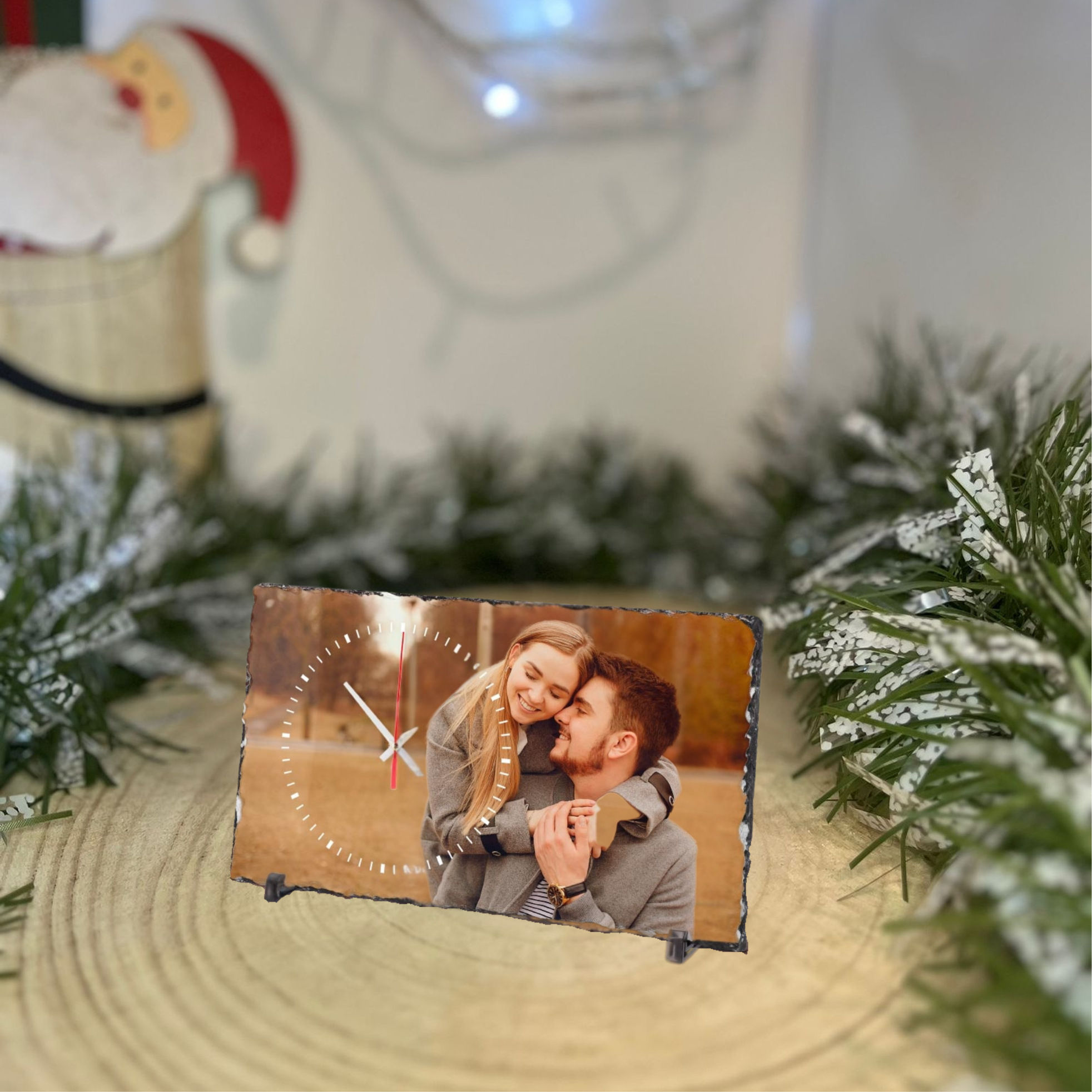 A fotografia é impressa diretamente na superfície, garantindo cores vivas, detalhes nítidos e um acabamento duradouro. O relógio de ponteiros adiciona um toque elegante e funcional, tornando esta ardósia perfeita para presentes personalizados, recordações familiares, decorações de interior ou lembranças de ocasiões especiais.