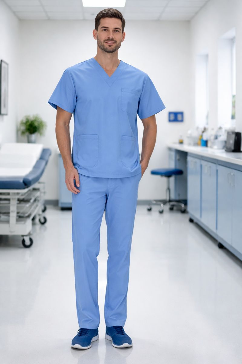 Composto por casaco de trabalho e calças, este conjunto oferece liberdade de movimentos e conforto durante longos períodos de uso. O design simples e funcional adapta-se às exigências do dia a dia dos profissionais de saúde.