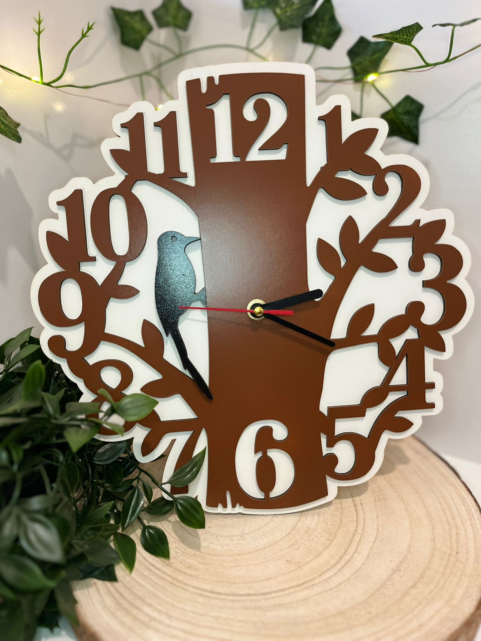 Este relógio de parede é feito em MDF lacado em branco, com uma camada dupla pintada em castanho. O design apresenta uma árvore estilizada, com galhos e folhas espalhados pela superfície do relógio, e um pássaro delicadamente desenhado a pousar em um dos galhos.