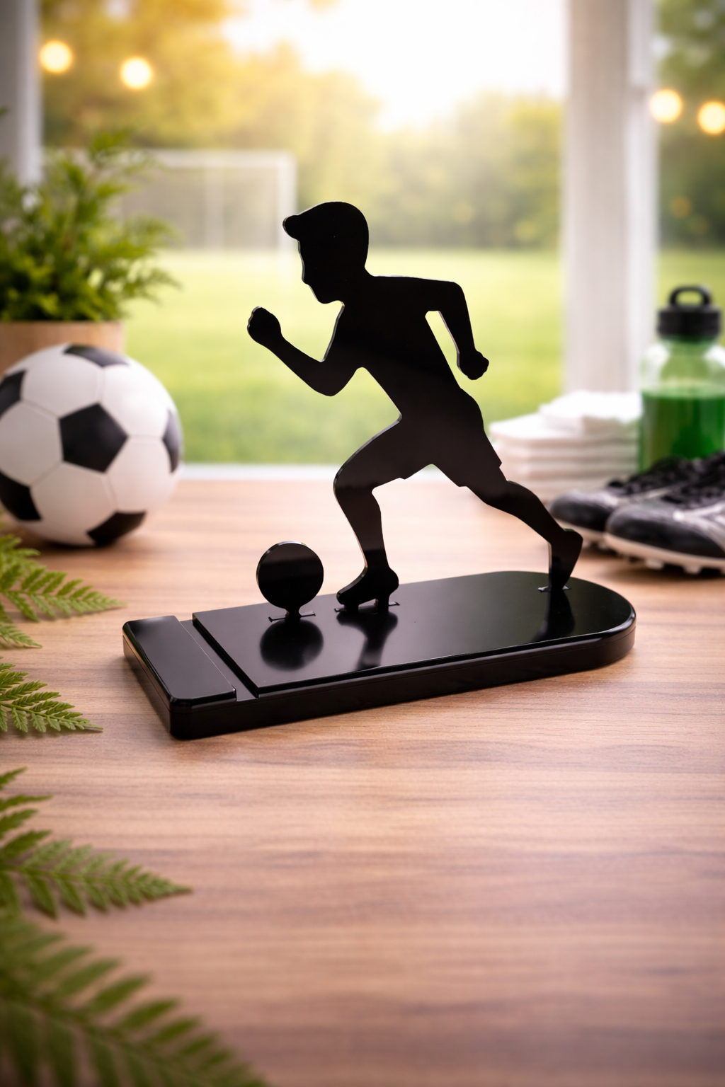 Dá um toque desportivo ao teu espaço com o Suporte para Telemóvel Futebol – Jogador em Ação, um acessório funcional com um design moderno e cheio de personalidade.