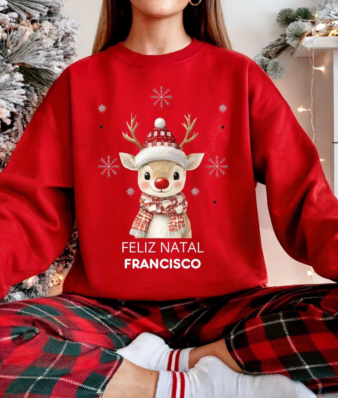 O detalhe especial está na personalização com o nome, tornando cada sweatshirt única — criada especialmente para oferecer ou usar em momentos mágicos de Natal.