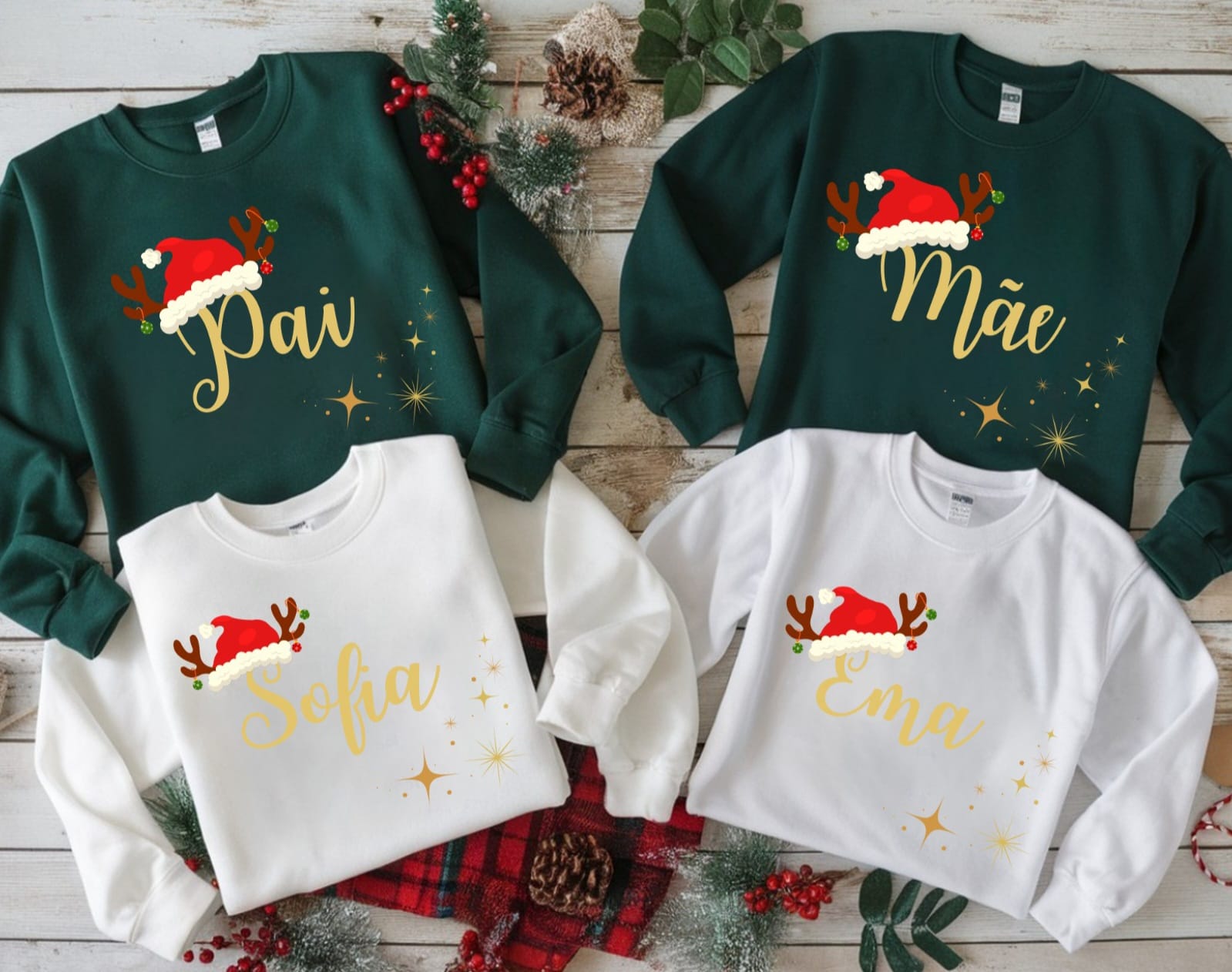 Cada sweat é personalizada com o nome de cada membro da família, acompanhado por um adorável gorro de Pai Natal e detalhes dourados brilhantes que captam o verdadeiro encanto desta época festiva.