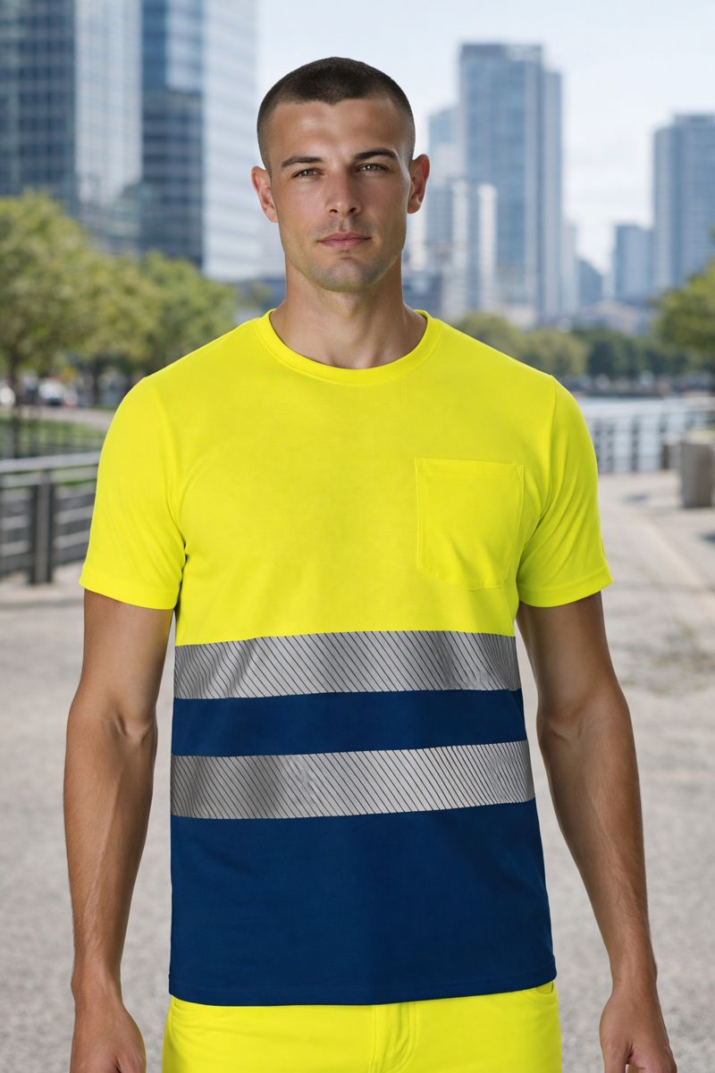 A T-Shirt de Alta Visibilidade é uma peça bicolor de manga curta com bolso, desenvolvida para trabalho profissional, garantindo segurança e conforto no dia a dia.